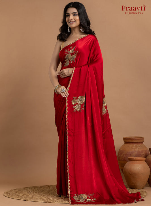 Red Crepe Satin Gold Metal Hand Work Saree