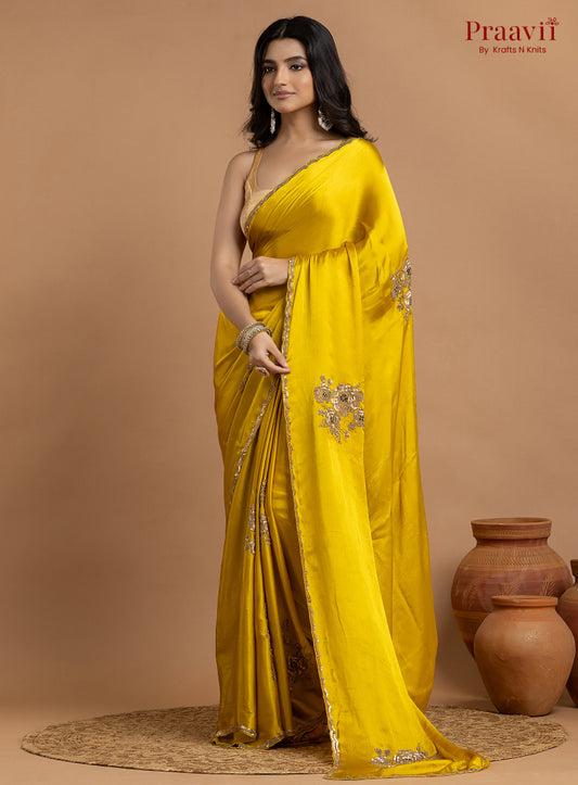 Yellow Crepe Satin Gold Metal Hand Work Saree