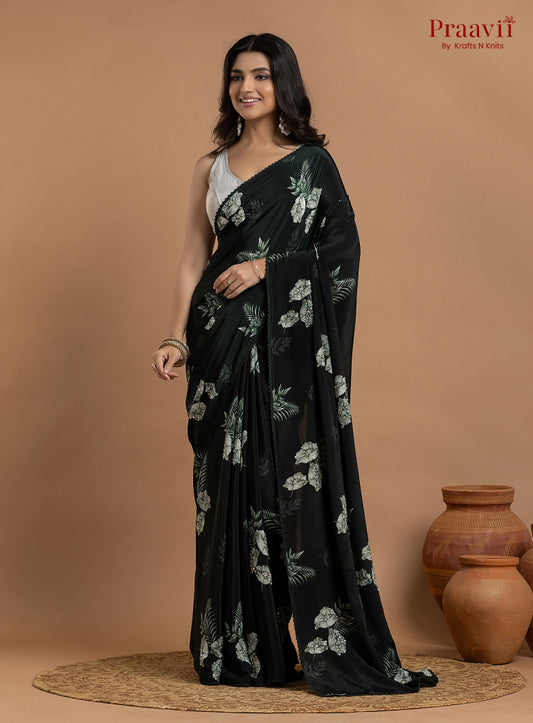 Dark Bottle Green Crepe Satin Saree with Sequin Work
