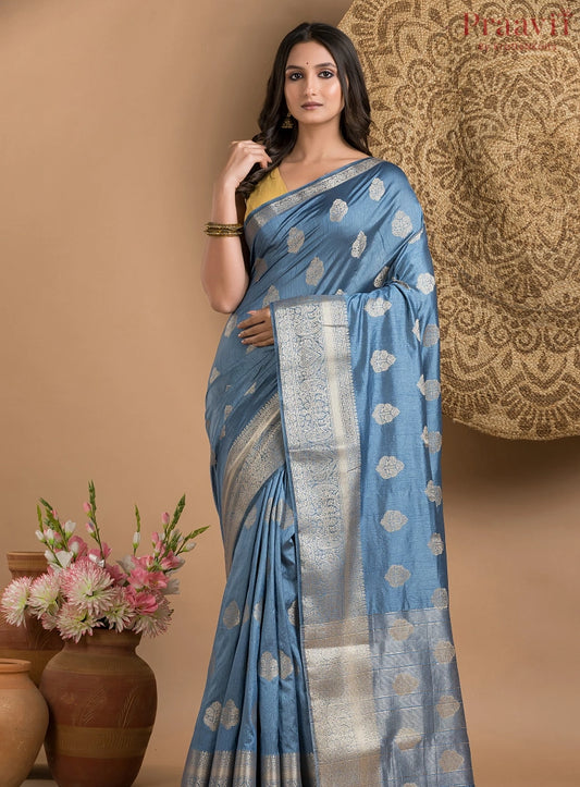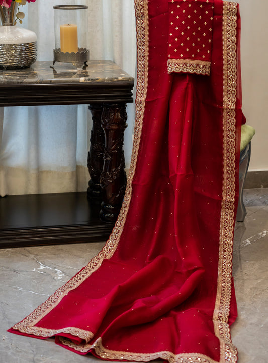Organza sarees are made from silk or synthetic fibres. It is a thin, translucent fabric. Pure organza sarees are known for their lightweight and crisp texture. Organza fabric saree has elegant drapes, intricate embroidery, zari work, and sequins that add luxurious appeal, making them suitable for any occasion.