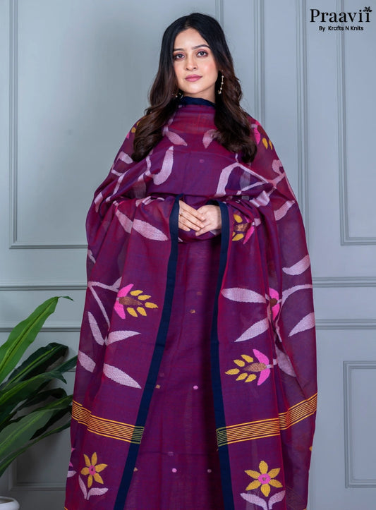 Purple Handwoven Cotton Jamdani Unstitched Suit Set