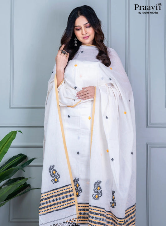 White Dhakai Jamdani Unstitched Cotton Suit Set