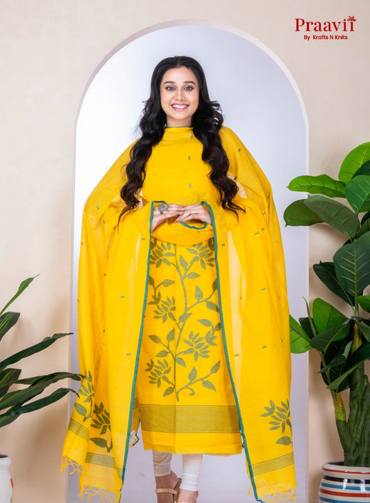 Yellow Handwoven Cotton Jamdani Unstitched Suit Set