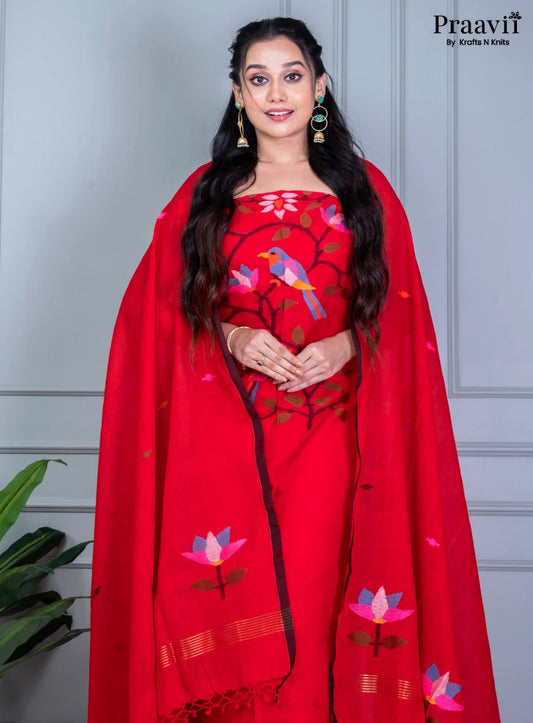Red Handwoven Cotton Jamdani Unstitched Suit Set