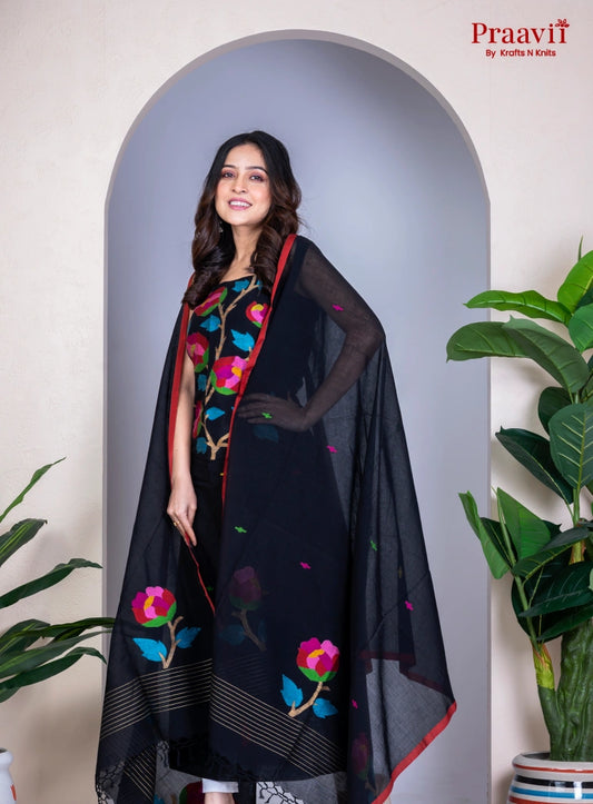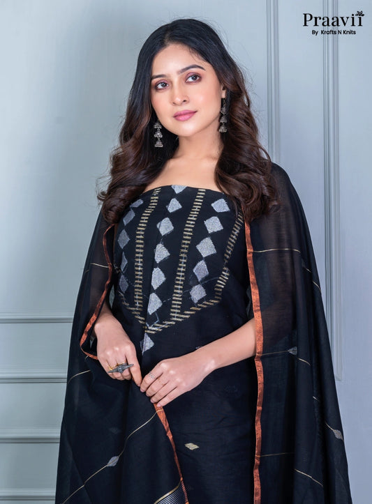 Black Cotton Jamdani Handwoven Unstitched Suit Set
