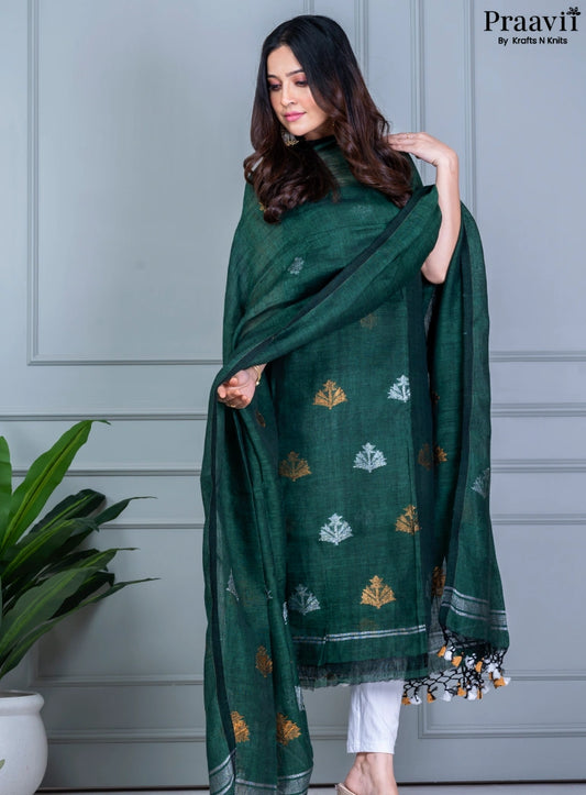 Bottle Green Linen Jamdani Unstitched Suit Set