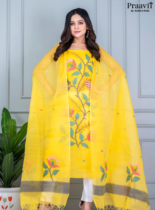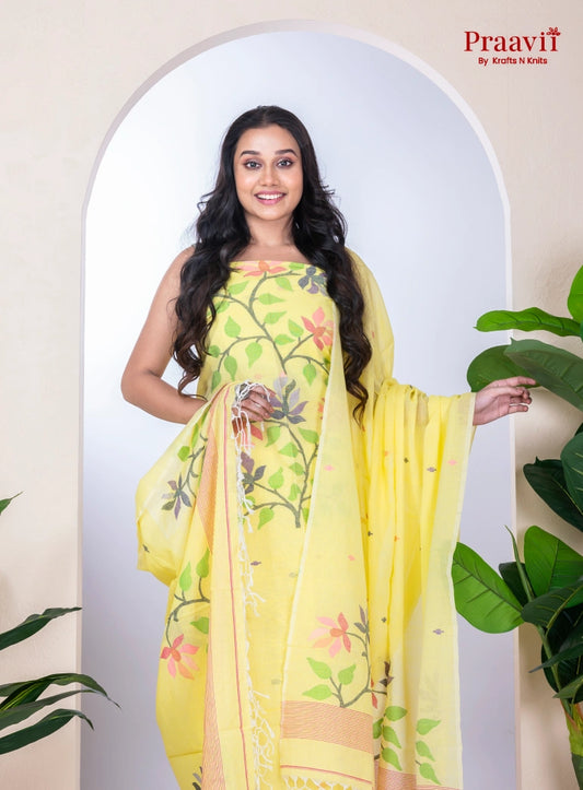 Yellow Cotton Jamdani Unstitched Handwoven Suit Set