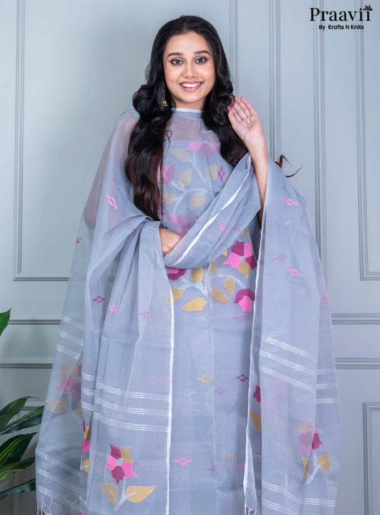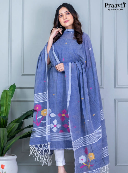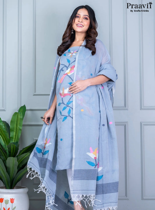 Grey Blue Unstitched Cotton Jamdani Suit Set