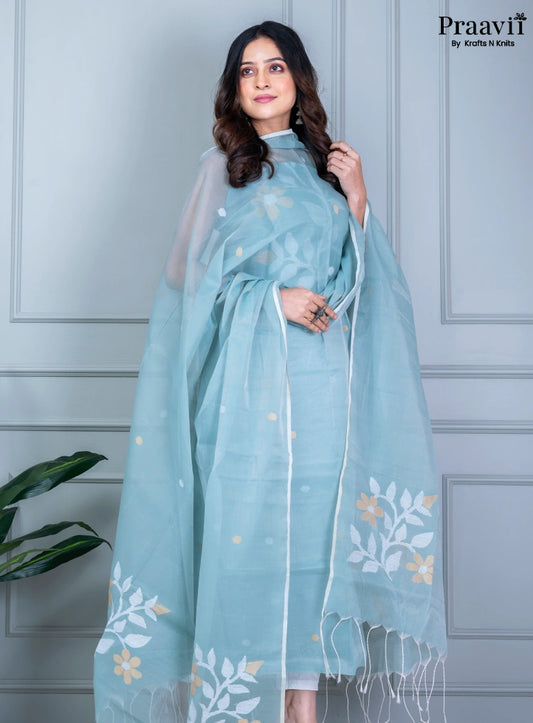 Celestial Blue Unstitched Cotton Jamdani Suit Set