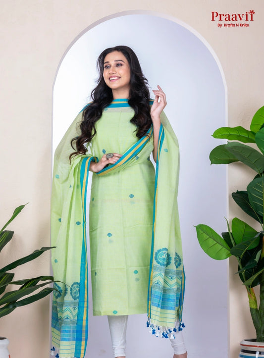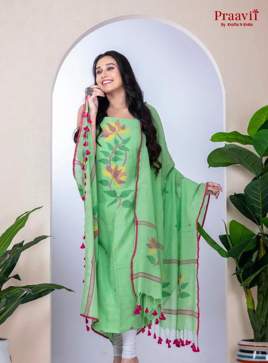 Lime Green Cotton Jamdani Unstitched Suit Set