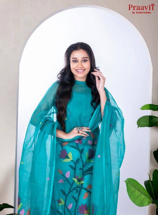 Turquoise Unstitched Muslin Jamdani Suit Set