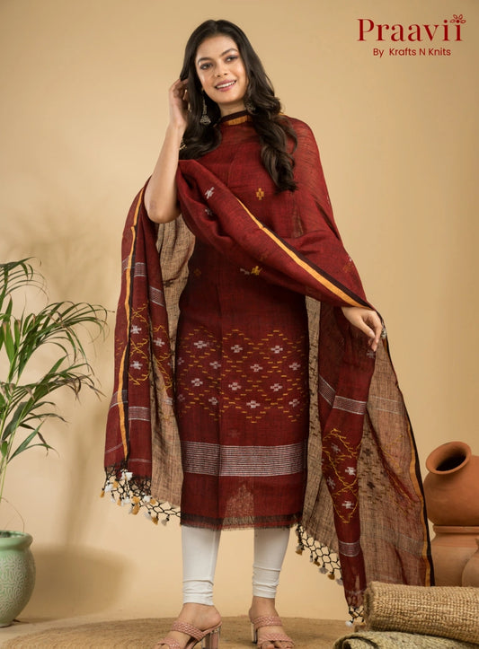 Chestnut Color Pure Linen Unstitched Jamdani Suit 2-Piece Set