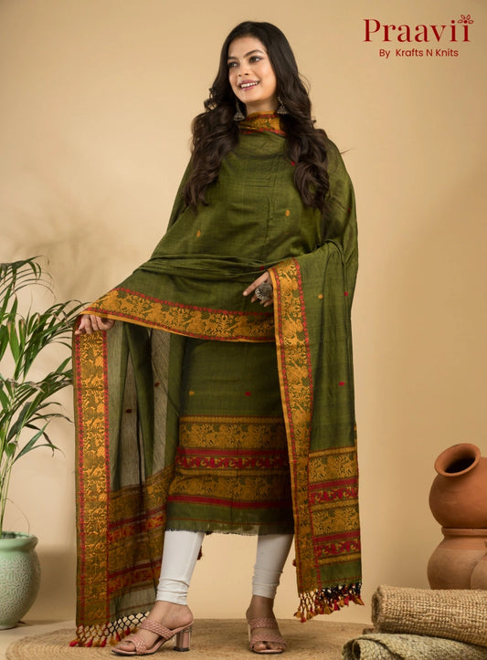 Pure Cotton Olive Green Baluchari Jamdani Unstitched 2-Piece Set