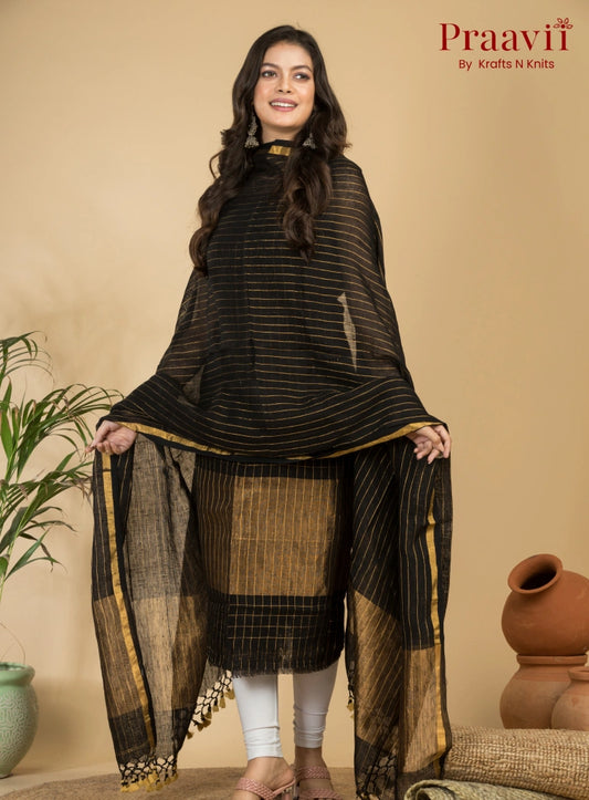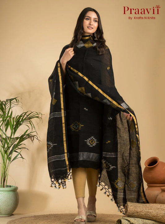 Jet Black Handloom Jamdani Linen Suit with Traditional Motifs