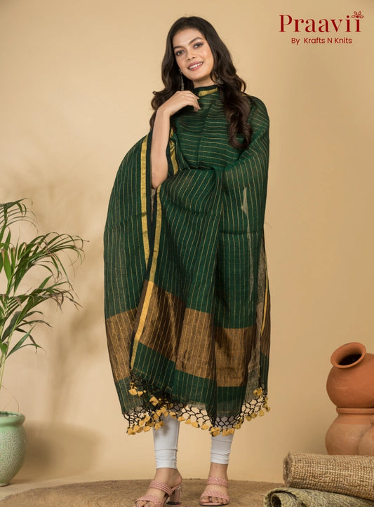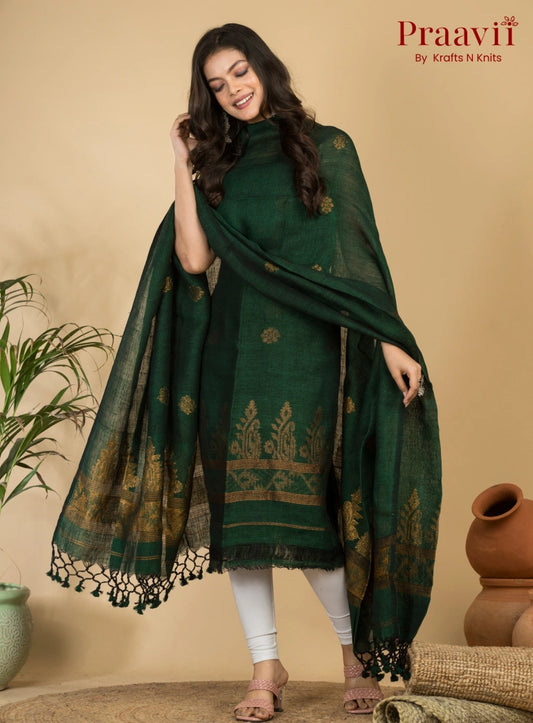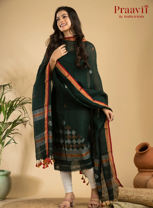 Dark Green Handloom Jamdani Linen 2- Piece Suit Set