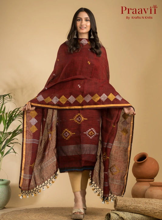 Maroon Handloom Jamdani Linen Suit with Traditional Motifs