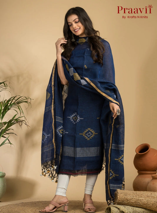 Designer Navy Blue Handloom Jamdani Linen Suit with Traditional Motifs