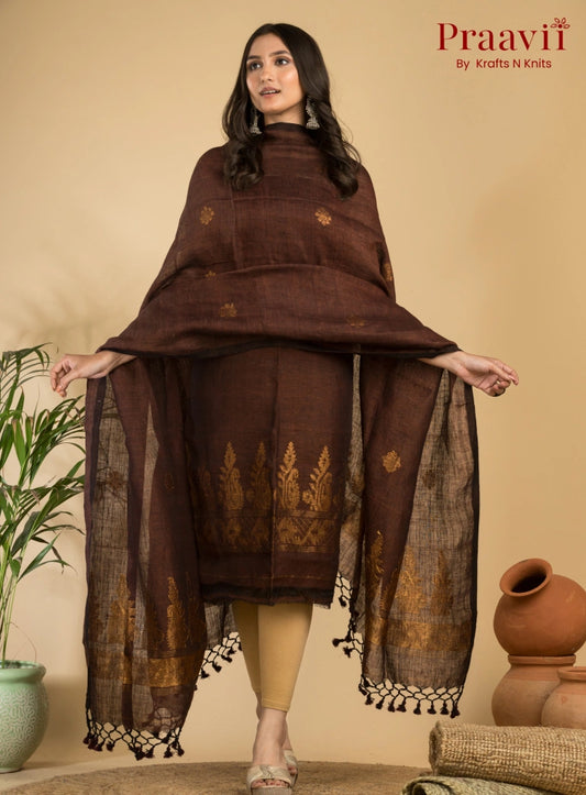 Dark Brown Handloom Jamdani Linen Suit with Traditional Motifs