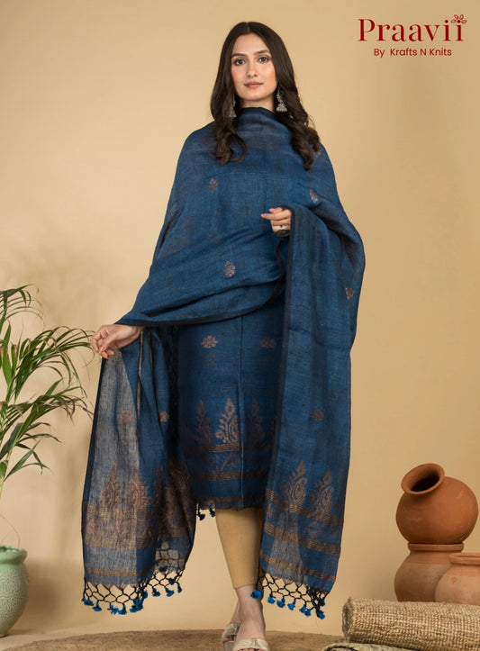 Royal Navy Blue Handloom Lilen Suit with Copper Zari Detailing