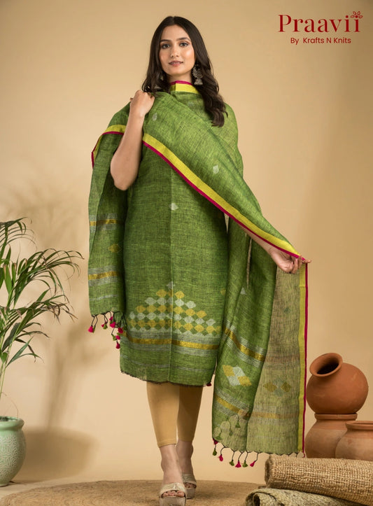 Fern Green Handloom Jamdani Linen Suit with Traditional Motifs