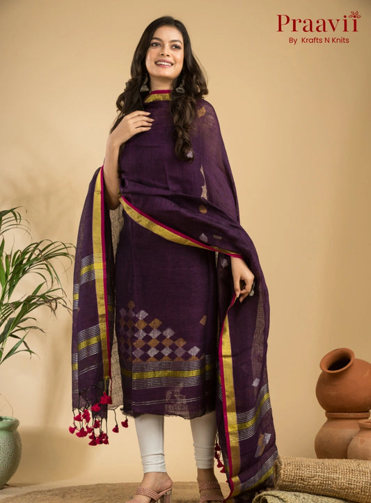 Dark Violet Handloom Jamdani Linen Suit with Traditional Motifs