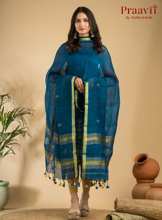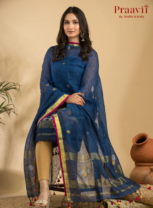 Lapis Blue Handloom Jamdani Linen Suit with Traditional Motifs