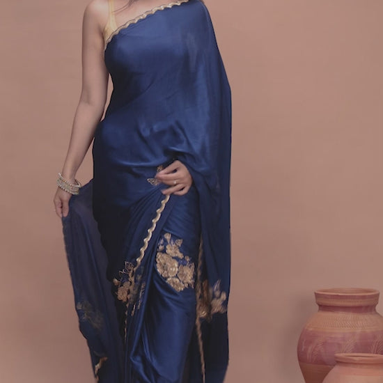 Blue Crepe Satin Gold Metal Hand Work Saree