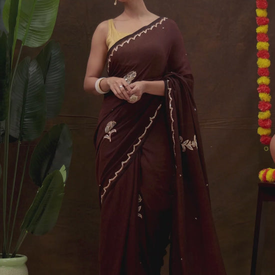 This handloom mulmul cotton saree comes in a warm brown shade, adorned with delicate hand embroidery that adds artisanal elegance. Soft, lightweight, and breathable, it drapes effortlessly for all-day comfort. Understated yet sophisticated, it’s perfect for casual gatherings, cultural events, or elegant everyday wear.