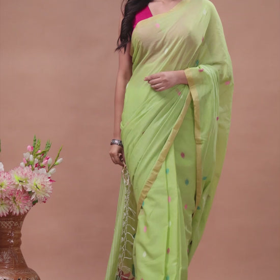 This pista green pure cotton Jamdani saree features a soft, breathable weave. The anchal carries broad Jamdani floral motifs in contrasting shades of pink, green, brown, and white, creating a vibrant, colorful highlight. The edges of the anchal are detailed with a white jal pattern that adds structure and definition to the design. Lightweight and easy to drape, this saree blends subtlety with eye-catching Jamdani artistry.