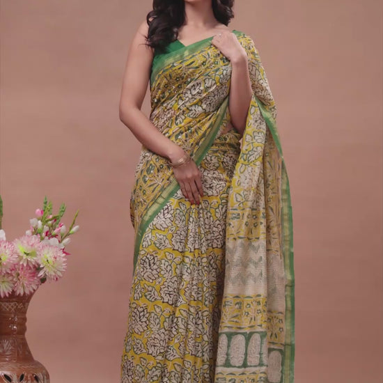 This yellow Chanderi saree features a soft, lightweight texture with green and white hand block motifs that stand out in clear contrast against the bright base. The patterns are crisp, detailed and evenly placed, showcasing the precision of the hand block technique. Vibrant yet simple, it’s a comfortable saree ideal for everyday wear, small occasions, or daytime outings.
